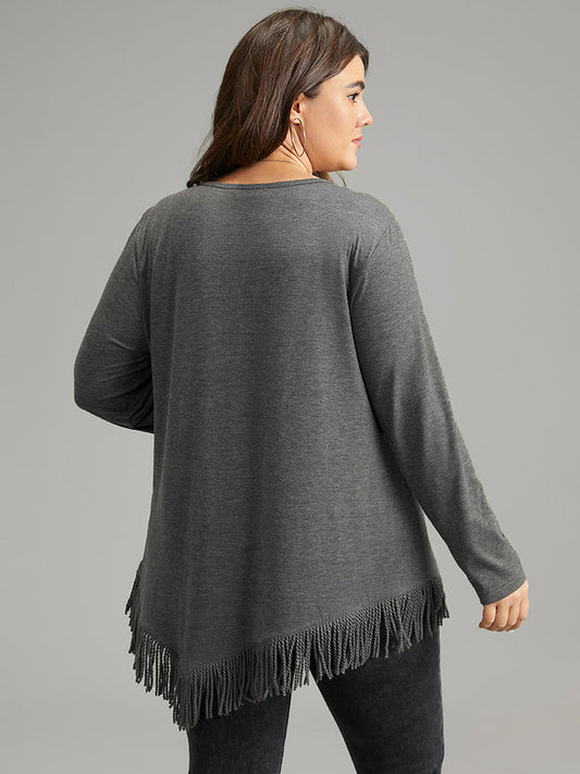 Plain Tassels Trim Hem Long Sleeve T-shirt