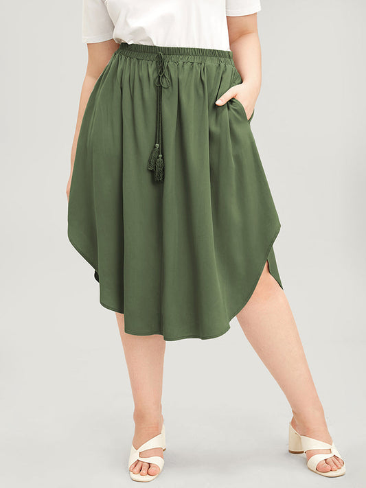 Plain Tassels Ties Elastic Waist Pocket Arc Hem Skirt