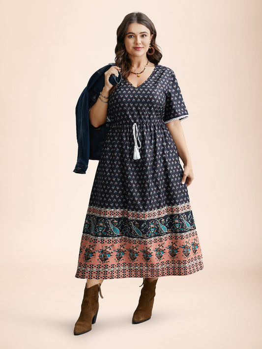 Boho Print Tassel-Tie Pockets Midi Dress