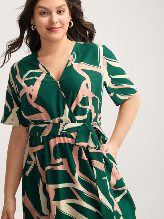 Abstract Belted Side Slit Surplice Midi Dress