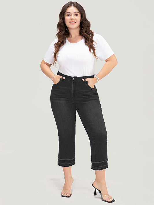 Bootcut Very Stretchy High Rise Medium Wash Distressed Hem Jeans