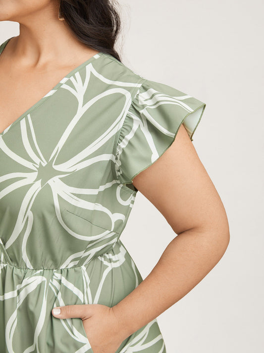Abstract Floral Print Ruffled Sleeve Maxi Dress