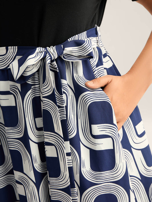 Abstract Pattern Color Contrast Belted Midi Dress