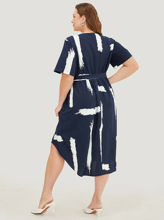 Brush Print Elastic Waist Wrap Split Hem Dress