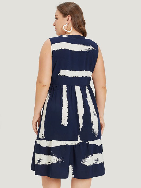 Brush Print Notched Ruffle Hem Elastic Waist Dress