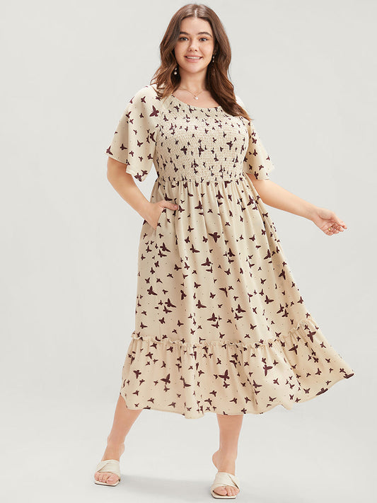 Butterfly Print Ruffle Trim Pocket Shirred Square Neck Dress