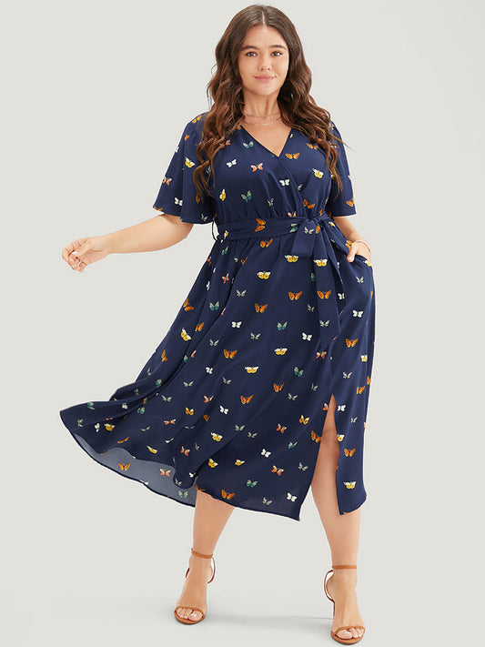 Butterfly Print Ruffle Hem Pocket Belt Surplice Neck Split Dress