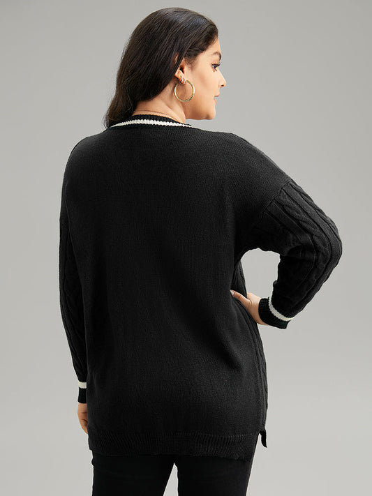Cable Knit Contrast Trim Drop Shoulder Pullover
