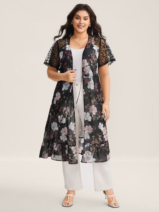 Chiffon Floral Mesh Wrap Ruffle Hem Blouse