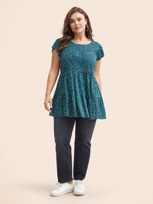 Allover Print Cap Sleeve Ruffle Hem Gathered Blouse