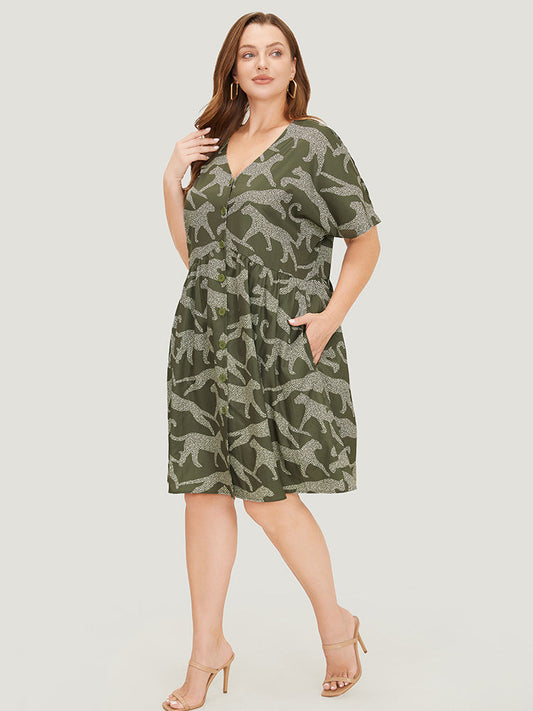 Animal Print Batwing Sleeve Flutter Pocket Button Up Dress