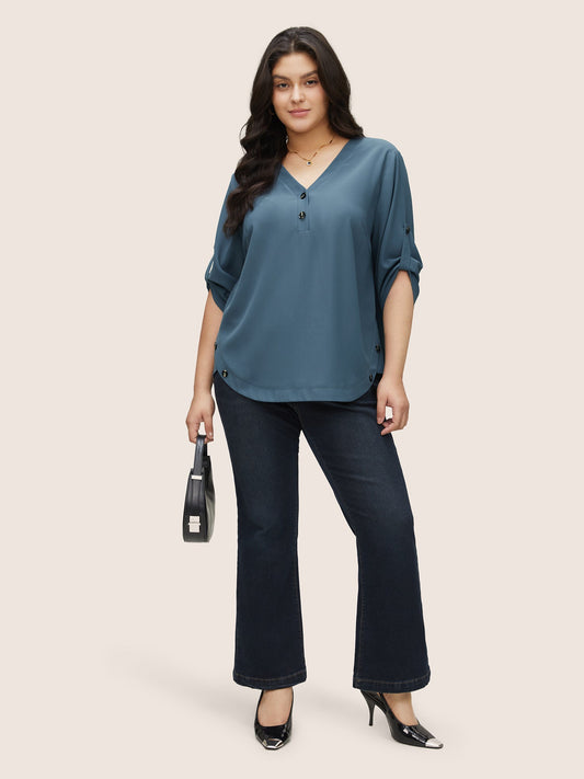 Anti-Wrinkle Button Detail Curved Hem Tab Sleeve Blouse