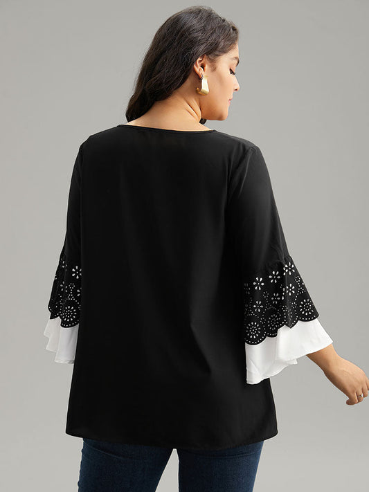 Anti-Wrinkle Laser Cut Contrast Ruffles Blouse