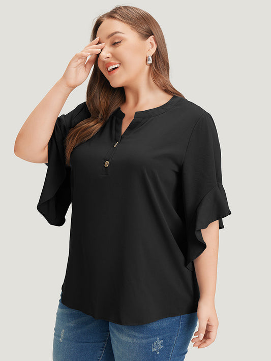 Anti-Wrinkle Plain Notched Flutter Sleeve Button Up Blouse