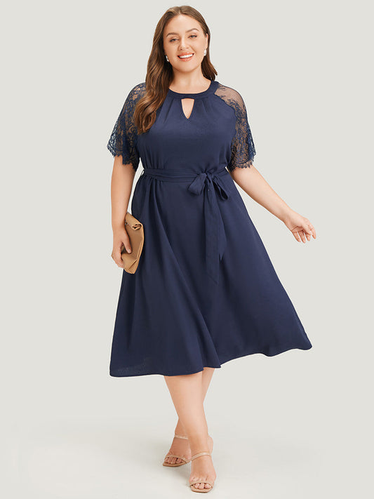 Anti-Wrinkle Plain Pleated Keyhole Neck Belt Lace Dress