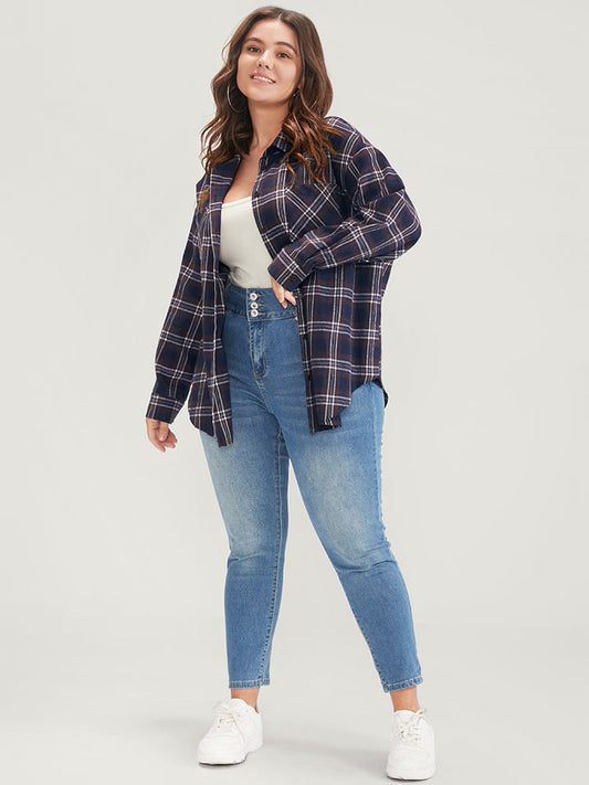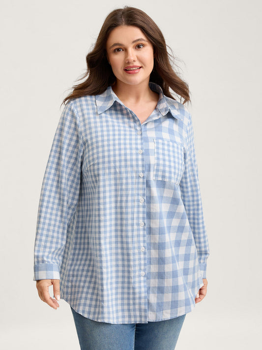 Asymmetrical Plaid Button Arc Hem Pocket Shirt Collar Blouse