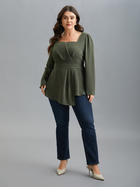 Asymmetrical Neckline Stretchy Waist Plicated Detail Blouse