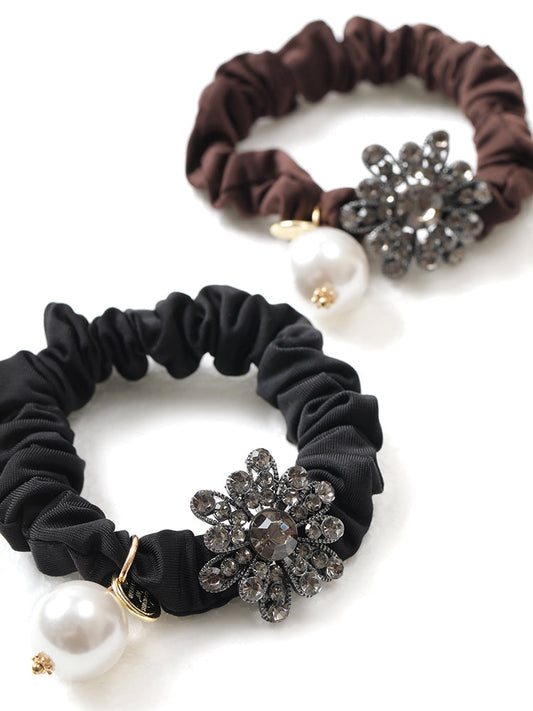 2pcs Velvet Floral Rhinestone Pearl Beaded Hair Ties