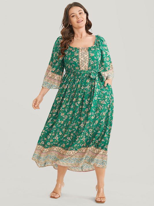 Bandana Flounce Sleeve Pocket Square Neck Belted Flutter Hem Dress