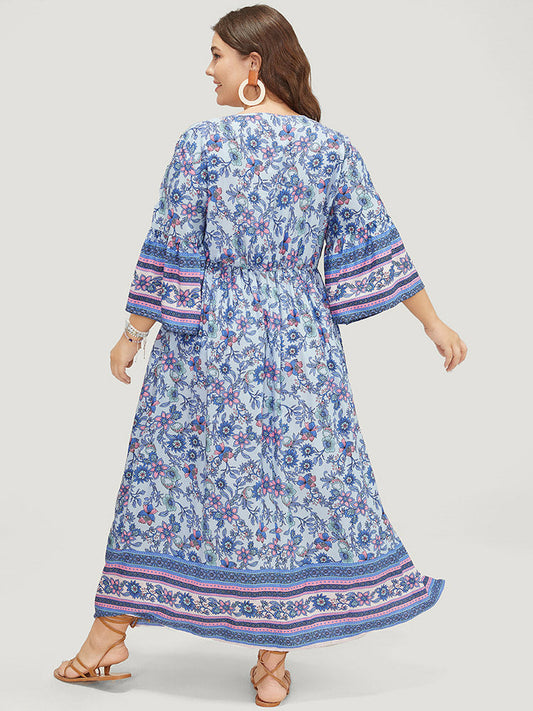 Bandana Flounce Sleeve Knot Button Detail Ruffle Hem Dress
