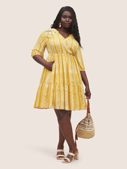 Bandana Geometric Notched Ruffle Layered Hem Dress