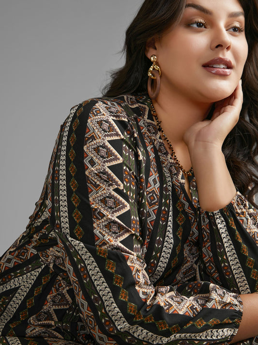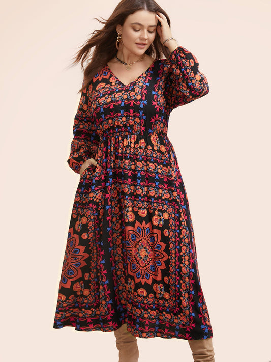 Bandana Lantern Sleeve Pocket Knotted Front Wrap Midi Dress