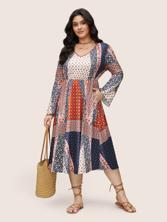 Bandana Patchwork Bell Sleeve Elastic Waist Dress