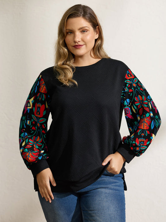 Floral Sleeve Drop Shoulder Textured Sweatshirt