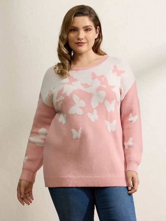 Butterfly Jacquard Pattern Ribbed Hem Pullover