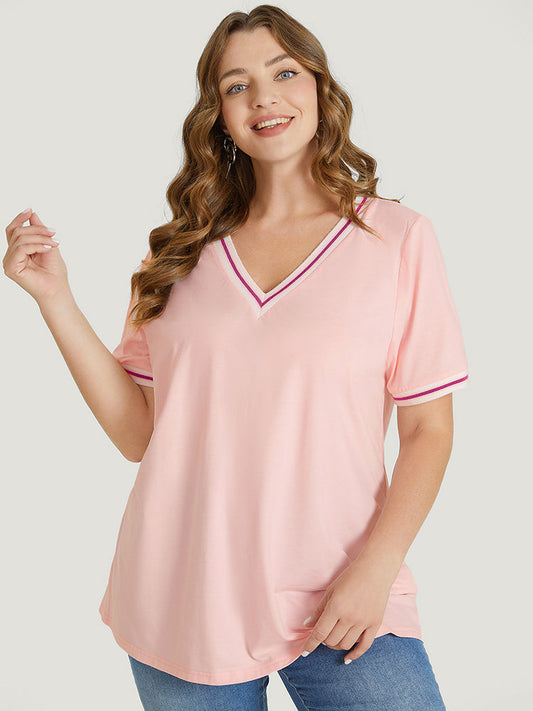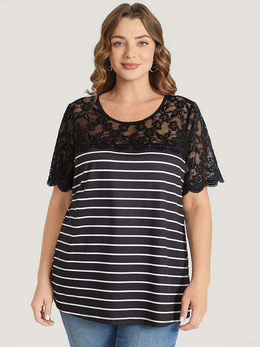 Striped Patchwork Lace Scalloped Trim T-shirt