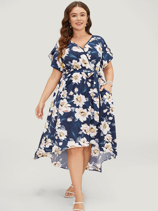 Floral Split Petal Sleeve Pocket Wrap Ruffle Asymmetrical Hem Dress