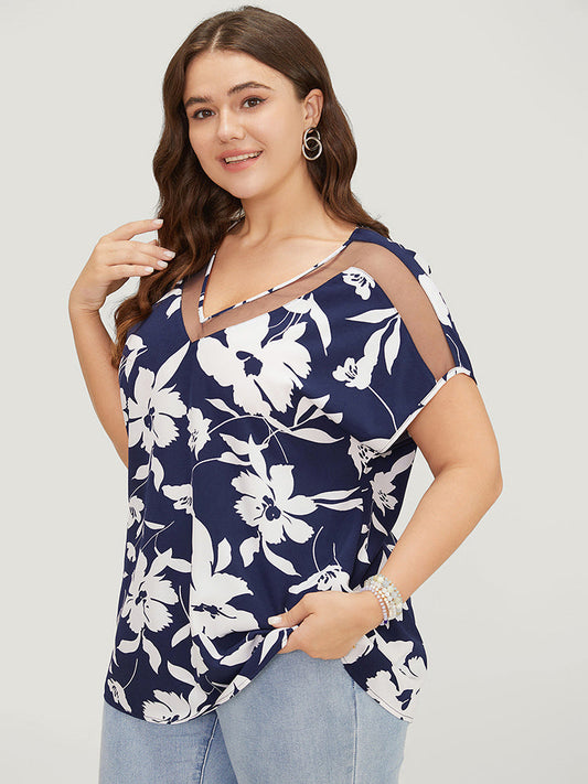Floral Mesh Insert Dolman Sleeve Blouse