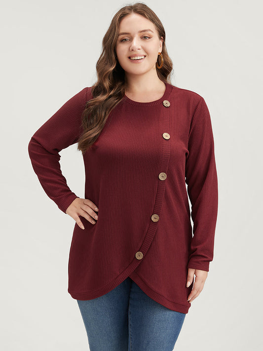 Solid Rib Knit Button Detail Asymmetrical Hem Sweatshirt