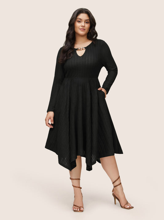Rib Knit Metal Chain Detail Keyhole Hanky Hem Dress