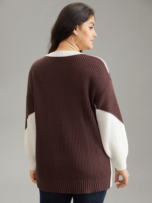 Colorblock Lantern Sleeve Drop Shoulder Loose Pullover