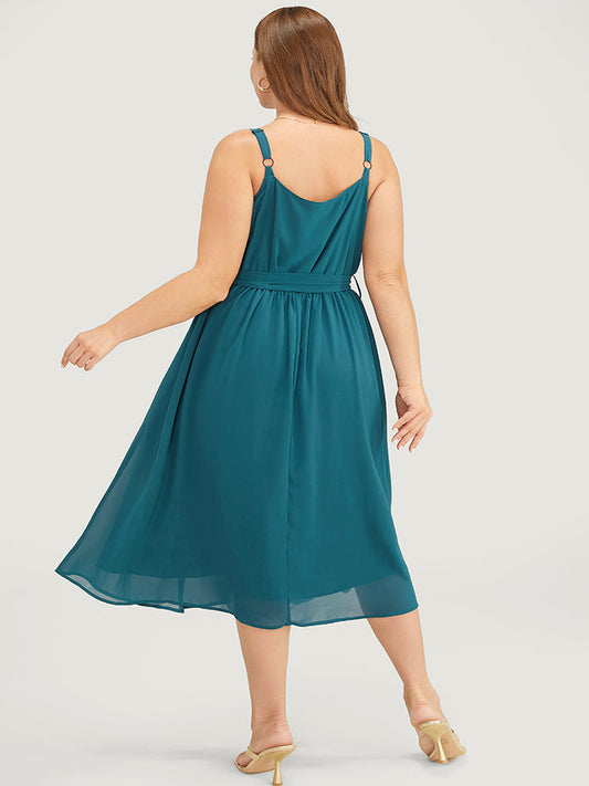 Plain Belted Pocket Ruffle Trim Surplice Neck Cami Dress