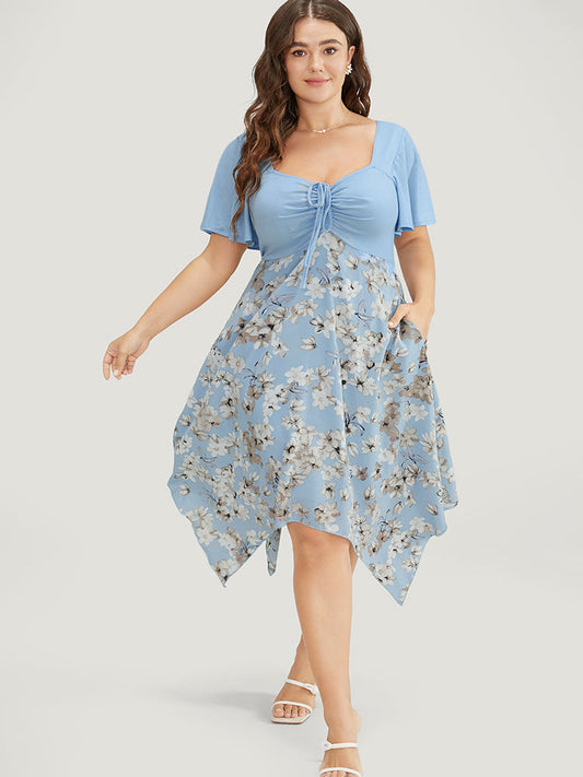 Floral Ruched Drawstring Ruffle Sleeve Pocket Hanky Hem Dress