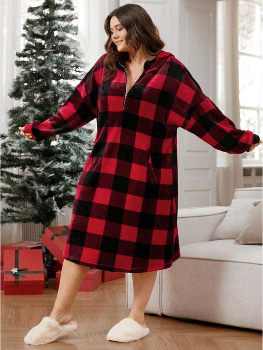Plaid Pocket Half Zip Flannel Hooded Dress