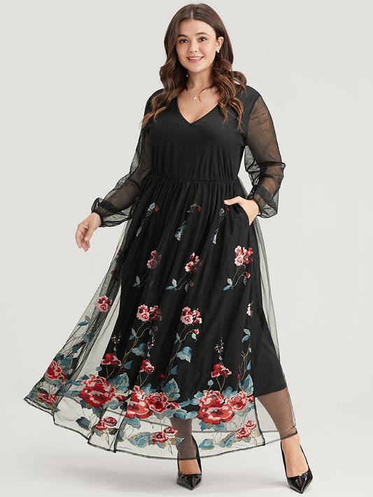 Floral Embroidered Mesh Lantern Sleeve Pocket Maxi Dress