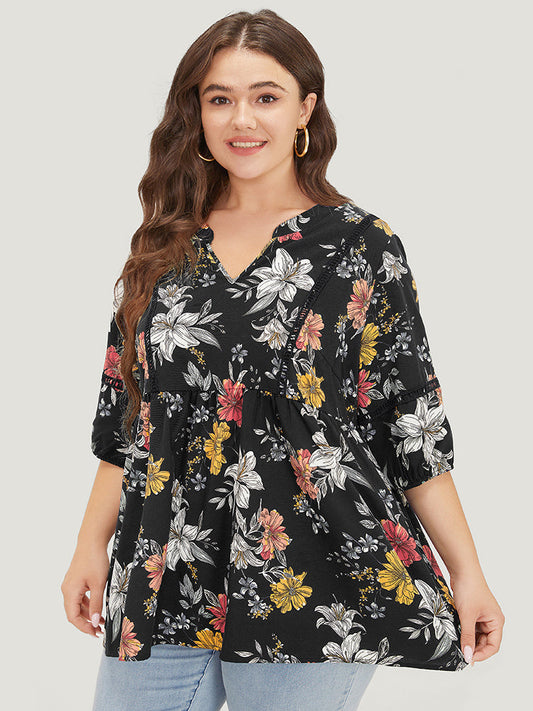 Floral Lantern Sleeve Lace Gathered Notched Blouse