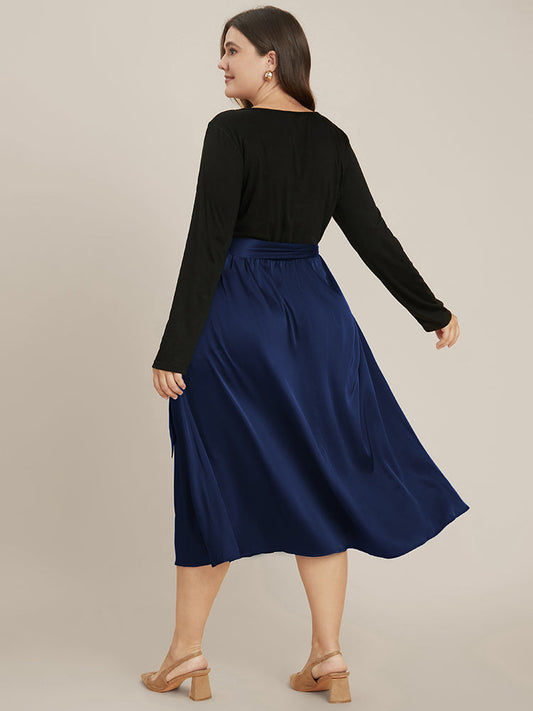 Solid Round Neck Pocket Button Detail Belted Satin Dress
