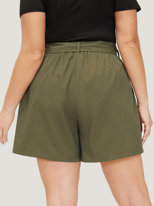 Plain Pleated Ruffle Sleeve Pocket Button Up Curved Hem Dress