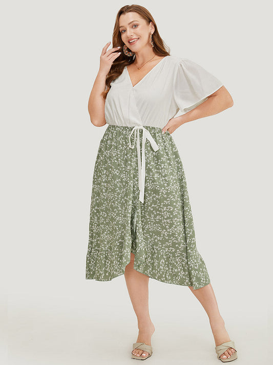 Ditsy Floral Patchwork Pocket Knot Belted Wrap Ruffles Dress