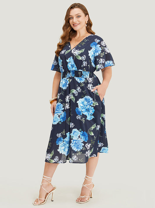 Floral Wrap Flutter Hem Pocket Shirred Dress