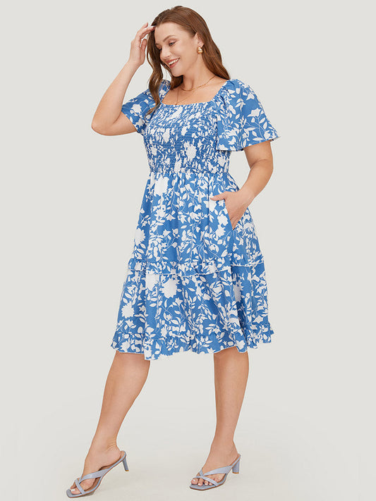 Floral Ruffle Trim Shirred Square Neck Pocket Dress