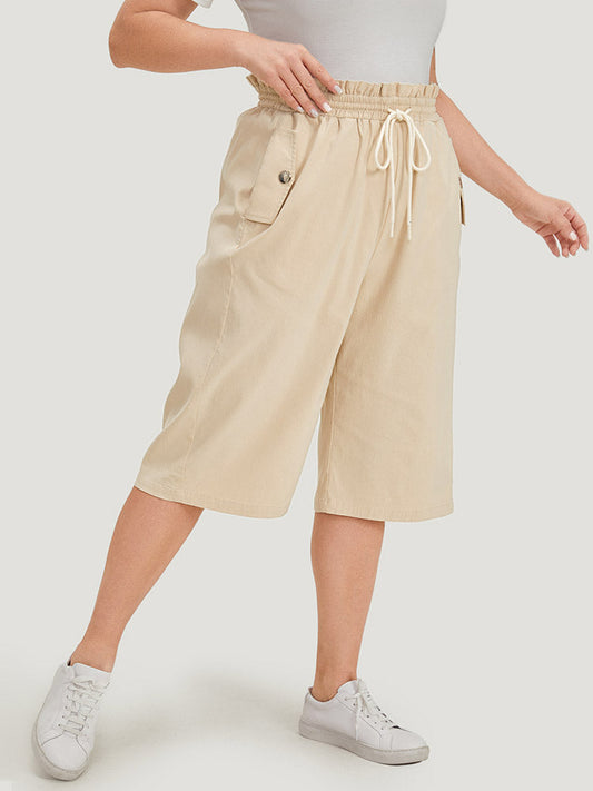 Solid Drawstring Button Detail Pocket Paperbag Waist Pants