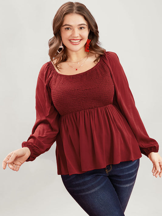 Solid Shirred Ruffles Lantern Sleeve Round Neck Blouse