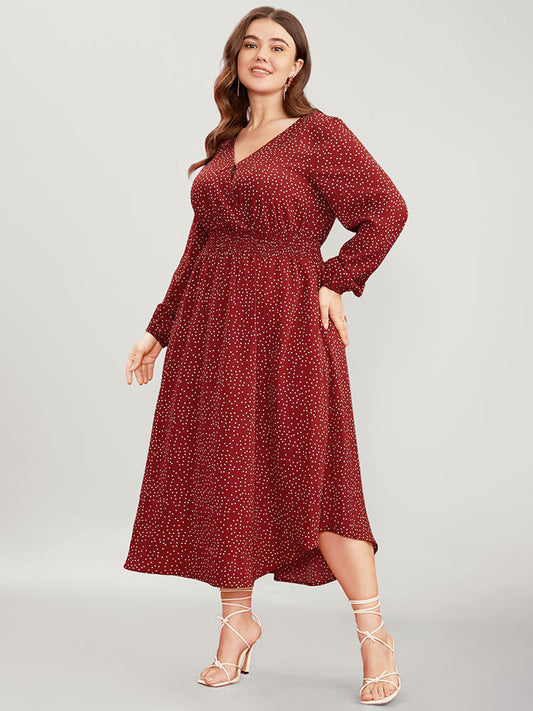 Polka Dot Wrap Lantern Sleeve Pocket Shirred Arc Hem Dress