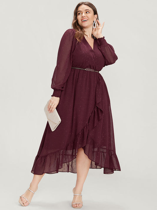 Solid Glitter Mesh Lantern Sleeve Shirred Wrap Flutter Hem Dress