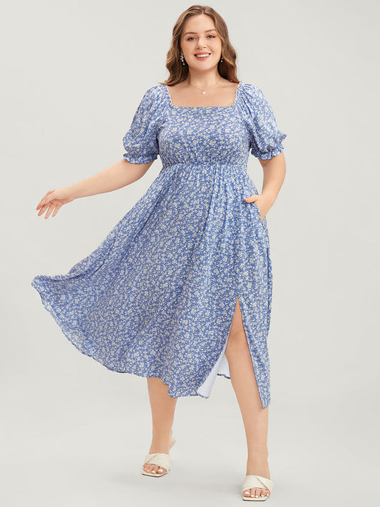 Ditsy Floral Puff Sleeve Pocket Square Neck Split Hem Dress